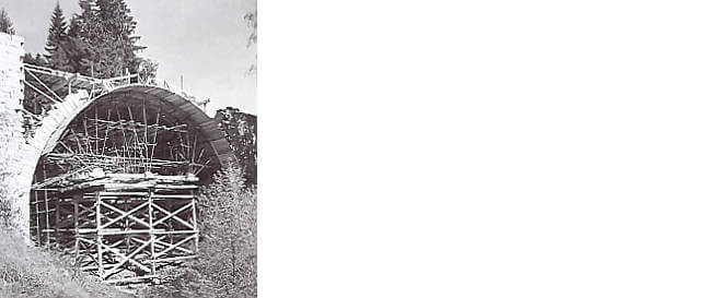 Einrichtung der Bogenbrücke über den Auerbach. Der Bogen wurde aus Fertigteilen hergestellt.