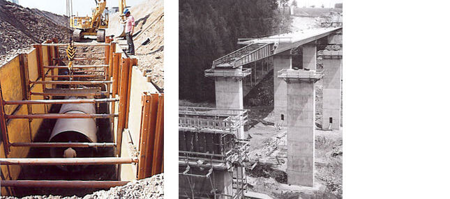 In der Dr.-Karl-Lenz-Straße in Memmingen verlegen wir unseren ersten Großkanal. Hungerbrunnentalbrücke im Zuge der BAB Memmingen-Würzburg; unsere erste Taktschiebebrücke (1975-1977).