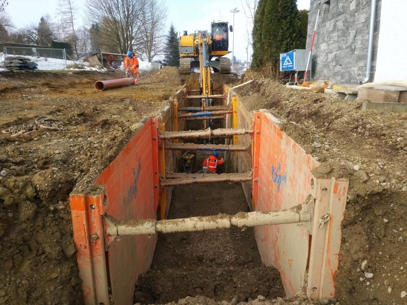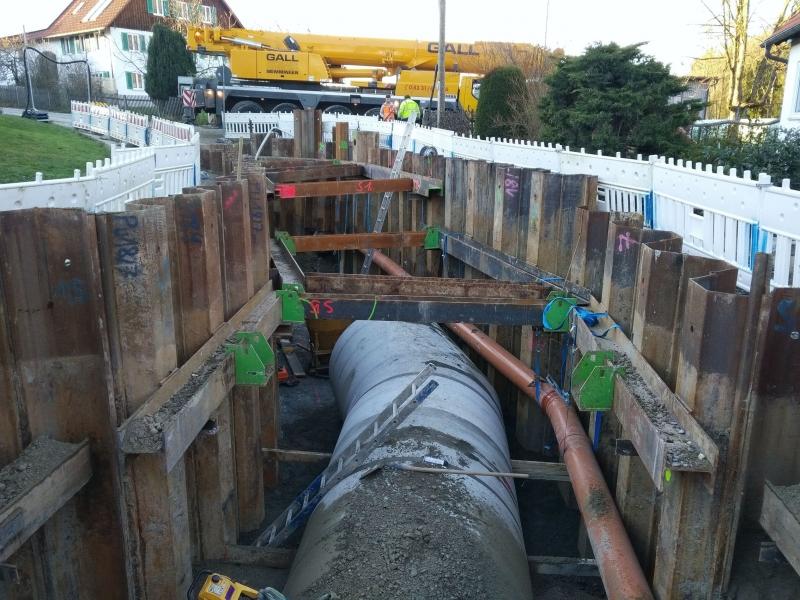 Herstellung des Stauraumkanales in einem geschlossenen Spundwandkasten mit Aussteifung ohne Rückverankerung. Baugrubensohle liegt unter dem anstehenden Grundwasserspiegel. Kanalverlegung DN 800 in Teilbereichen auf privatem Grundstück ( ca. 100 m)