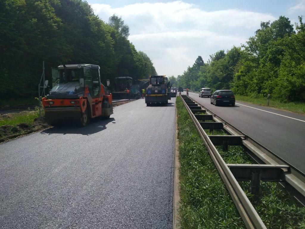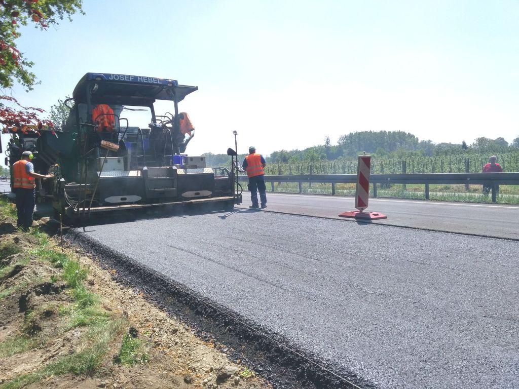 Einbau der Asphaltschichten während im hinteren Bereich noch Fräs- und Planierarbeiten ausgeführt wurden, Bankettarbeiten, Markierung, Schutzplanken, Gussasphalt