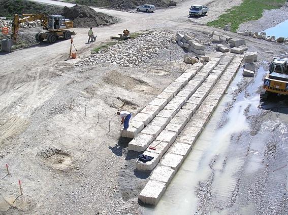 • Sicherung eines Brückenpfeilers in Form einer massiven Pfeilerinsel aus verfugtem Steinsatz auf Beton.