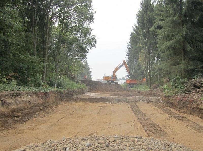 Herstellung einer neuen Erschließungsstraße für ein Gewerbe- gebiet quer durch einen Wald mit Kanal- und Kabelbauarbeitern. Herstellung einer Versickerungsanlage zur Aufnahme der Oberflächenwässer. Teilweise Rückbau der vorhanden „alten“ Industriestraße und Herstellung eines Rad- und Fußweges