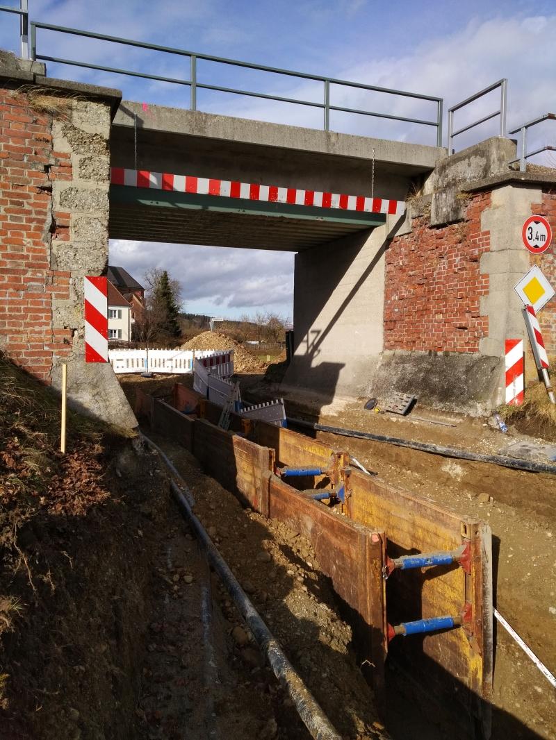 Wasserleitungsbau in 3 Meter Tiefe unter der Bestehenden Brücke hindurch.
