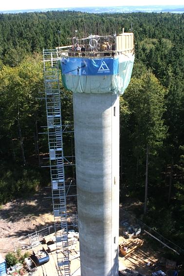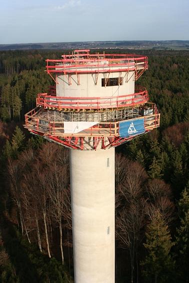 Der äußere Turmschaft (d = 5.20 m) wurde gleichzeitig mit dem innenliegenden Aufzugskern innerhalb von 12 Tagen in Gleitschalungsbauweise erstellt. Hierfür wurde auf der Baustelle im 24-Std.-Betrieb an 7 Tagen die Woche gearbeitet. Pro Tag wurden so ca. 4.5 m an Höhe überwunden.